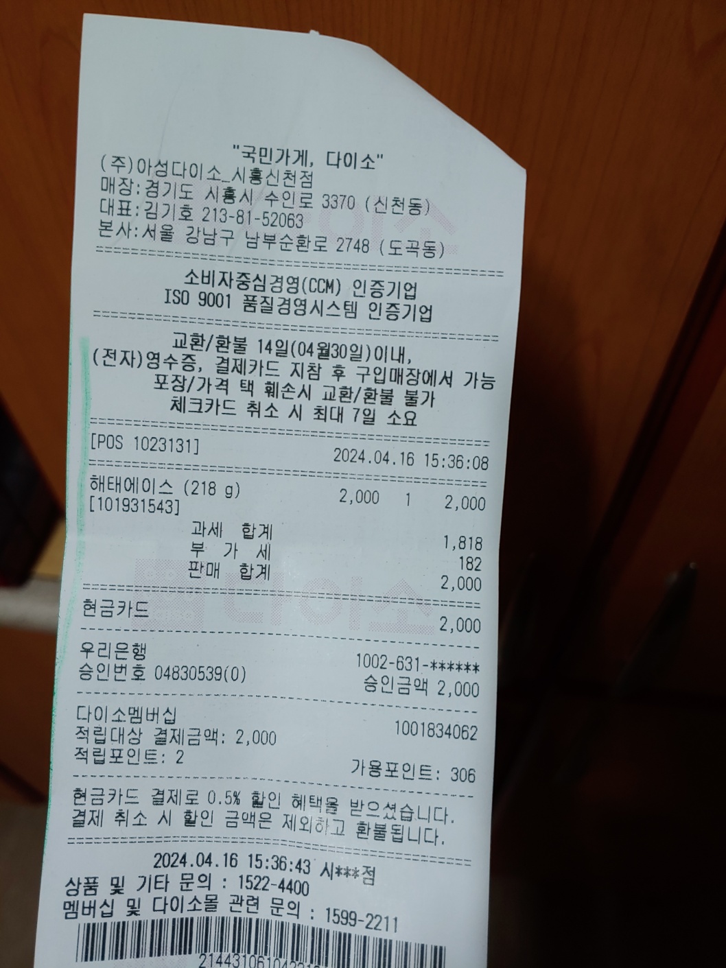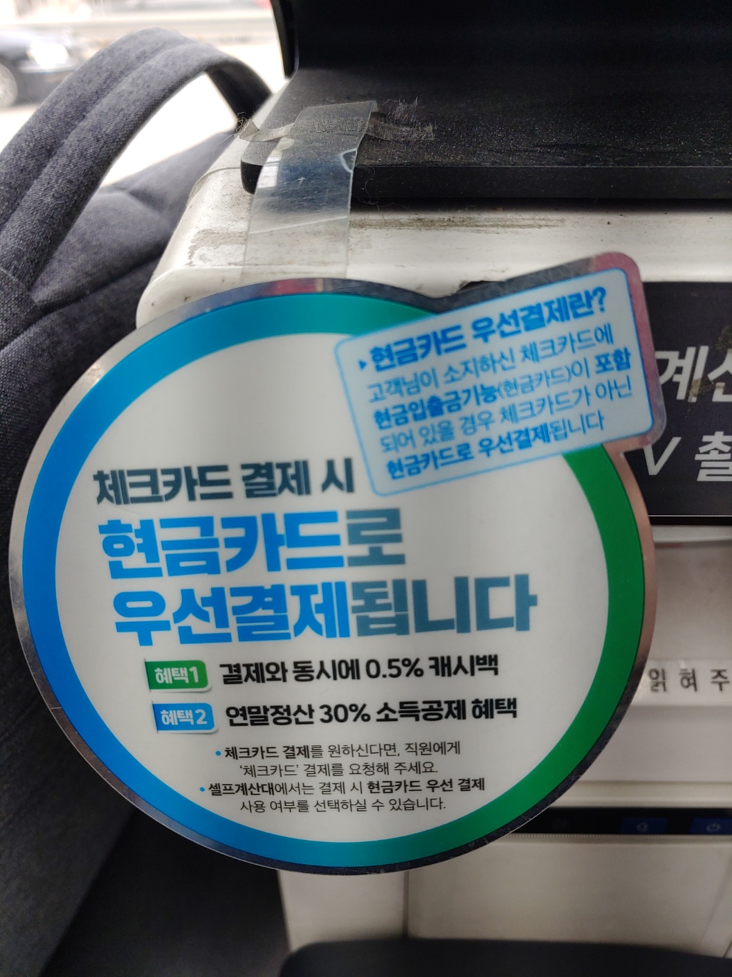 다이소 영수증에 계속 '현금카드 결제 시 0.5% 할인 혜택'이라는 내용이 있어