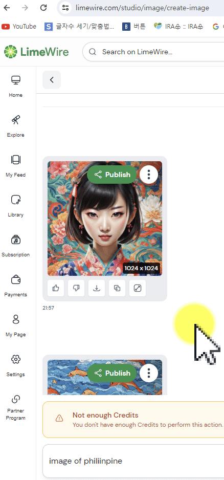 라임라이트는 10번 무료로 이미지 생성할 수 있고 그 이후는 유료 전환 후 쓸 수 있다.
