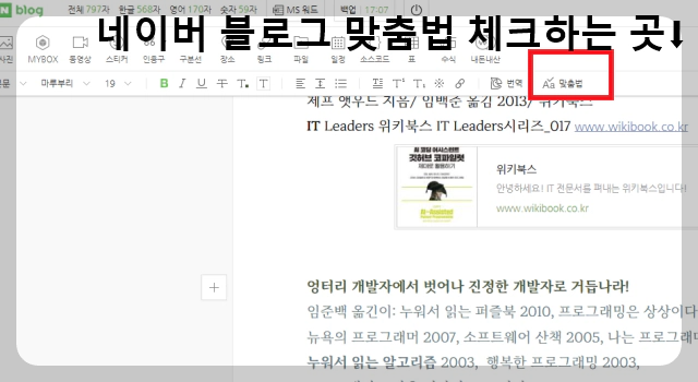 네이버 블로그 글쓰기도 병행해야 하는 상황에서 네이버 블로그에는 맞춤법 체크하는 곳이 작업창 윗쪽에 있는 것을 알게 되었다